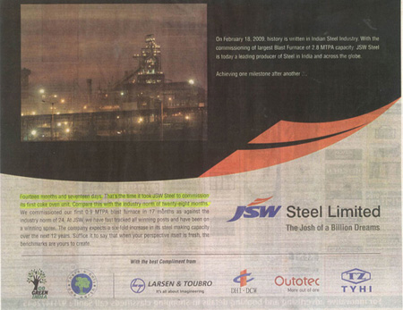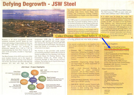 On Feb.18,2009, the most influential “Times Global” gave a special coverage to the successful operation of JSW’s 7MTPA Steel Complex Extension Project. Thereinto, the 1.5MTPA Stamp Charging Coke Oven Project constructed by Sinosteel MECC was highly evaluated for setting up the record of shortest construction period of Indian like projects and keeping in good operation. It took only 14 months and 17 days to put this coke oven project into production, comparing with the 28 months of similar coke oven projects in India.